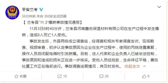 来自河南省兰考县公安局的消息称,11月3日6时40分许,兰考县河南兰考鑫宏保温材料有限公司在生成过程中发生爆燃,造成8人死亡1人受伤。