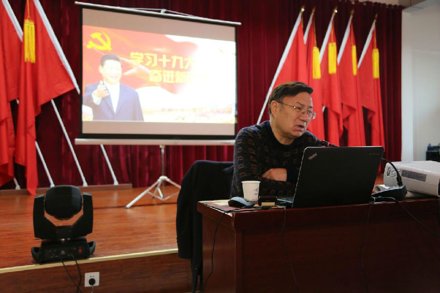 他指出,学习十九大报告,并不仅仅是读读报告原文那么简单,而是要深入的学,必须学深、学好、学透,因为党的十九大报告为中国未来特色社会主义的发展指明了方向,也是关系全党和全国各族人民切身利益的、十分重要的一个报告。他主要从中国共产党第十九次全国代表大会的主题、党的十八大以来取得的历史性变化和新成就、进入新时代以后中国特色社会主义的主要矛盾和历史方位、习 近平新时代中国特色社会主义的思想、新时代开启中国特色社会主义现代化建设的新征程、影响中国以人为中心和新时代新党建六个方面进行了全面深入的讲解。